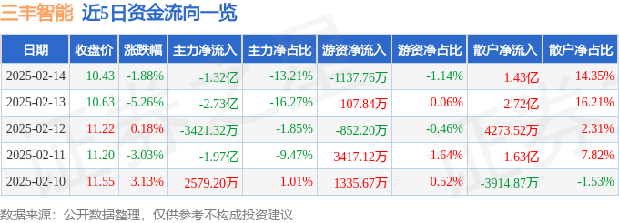 本站消息,截至2025年2月14日收盘,三丰智能(300276)报收于10.43元,下跌1.88%,换手率9.36%,成交量95.59万手,成交额9.96亿元。